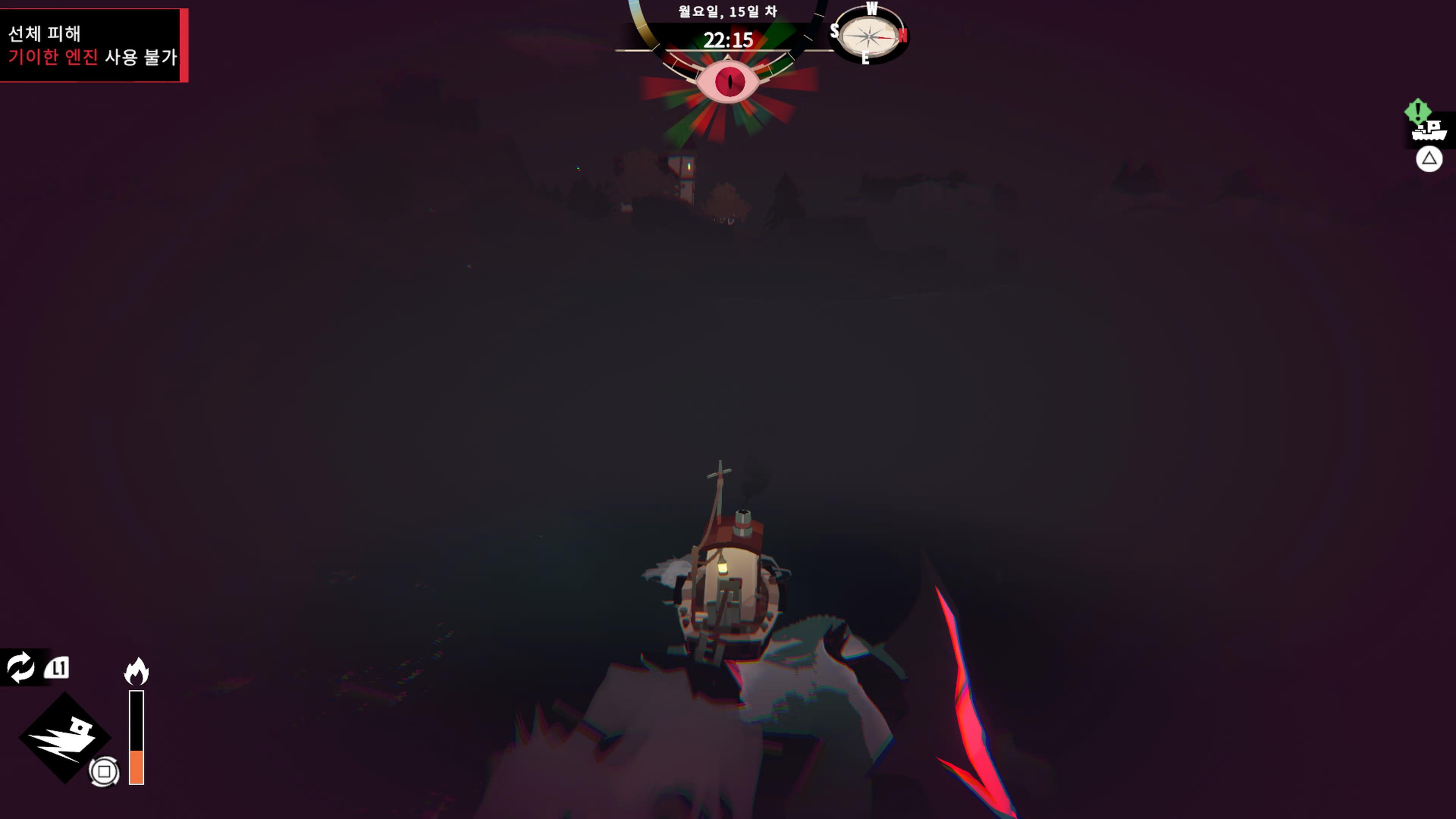 밤이 돼서 어두워지거나 하면 공포도 라는 게 올라가는데 그러면 위 사진처럼 눈알도 희번덕하게 뜨며 종종 괴물도 나타나 내 배를 부순다;;