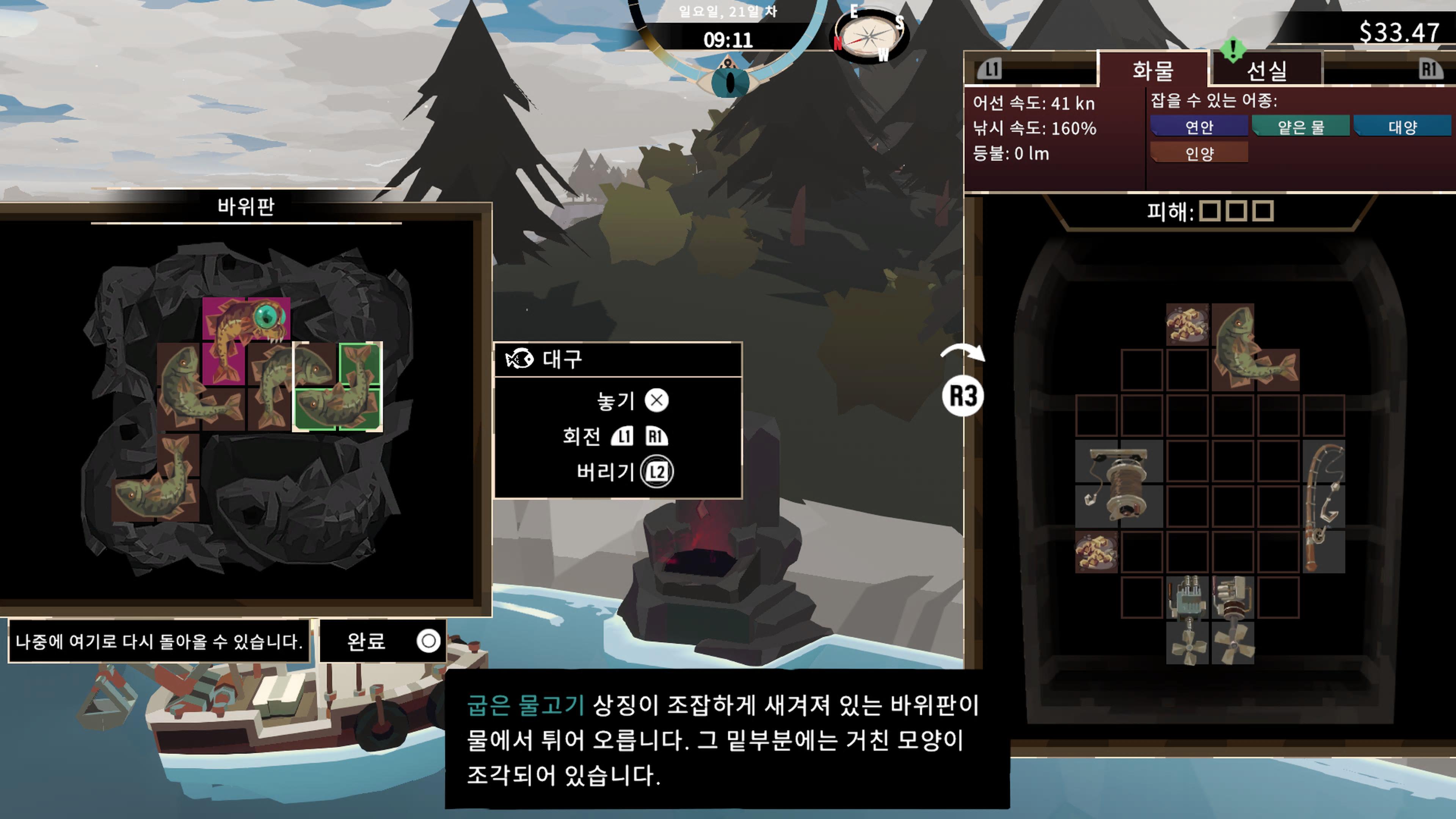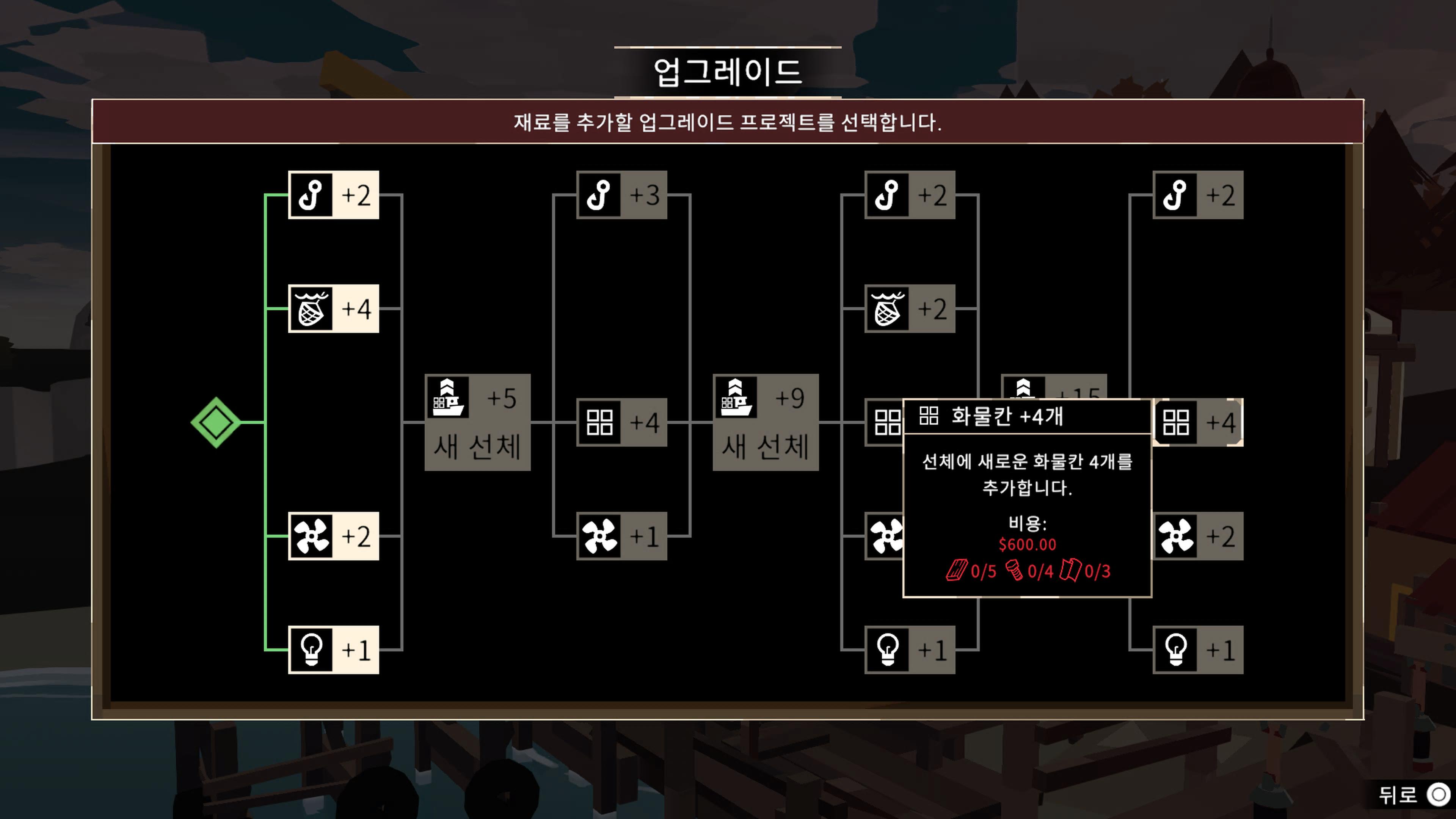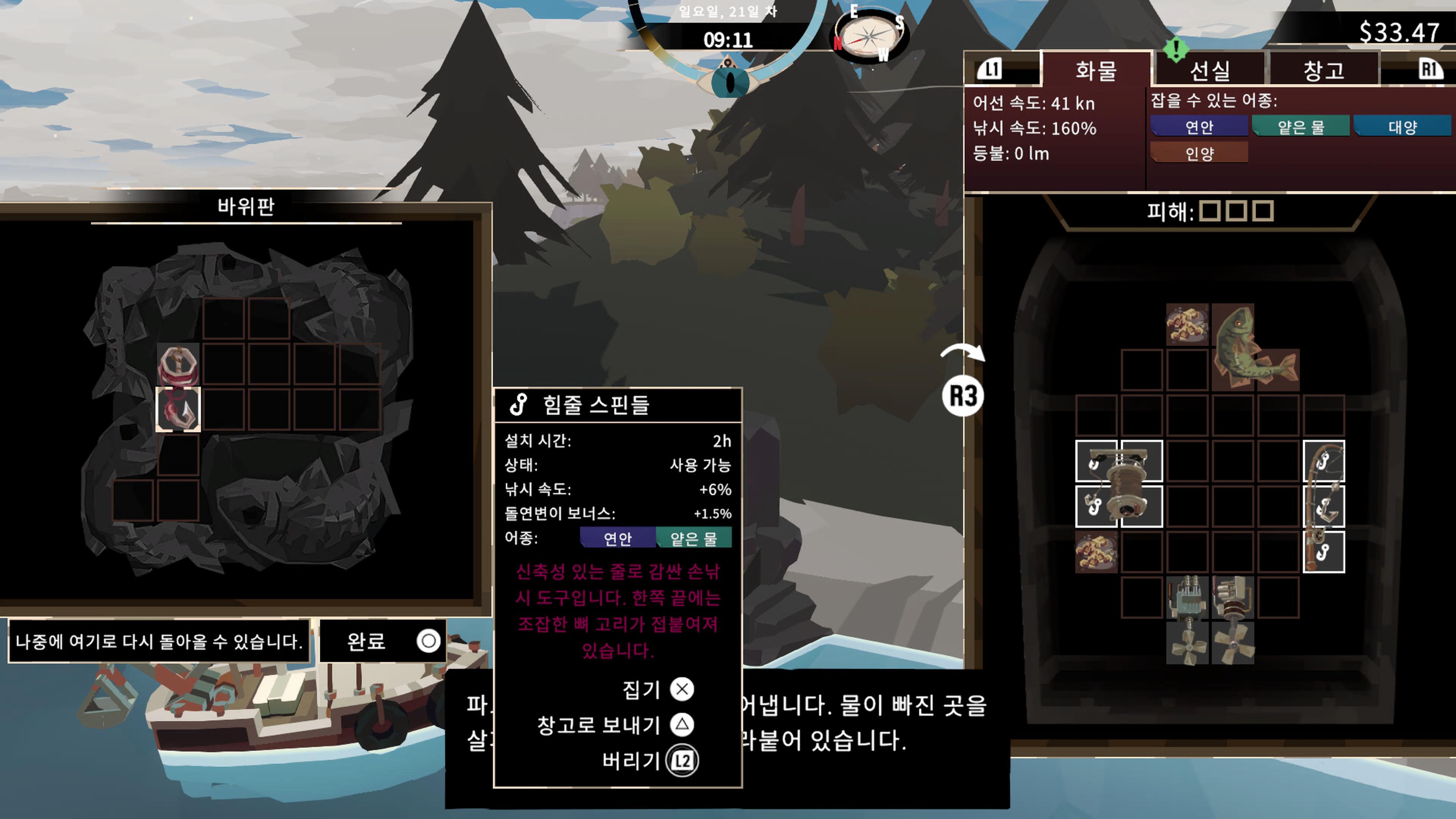 잡아온 물고기를 생선 장수한테 갖다 팔고 나면 연구부품을 주는데 초반에는 이걸 효율적으로 쓰는 게 게임 진행 속도에 영향을 꽤나 주기 때문에 현명하게 사용하자.