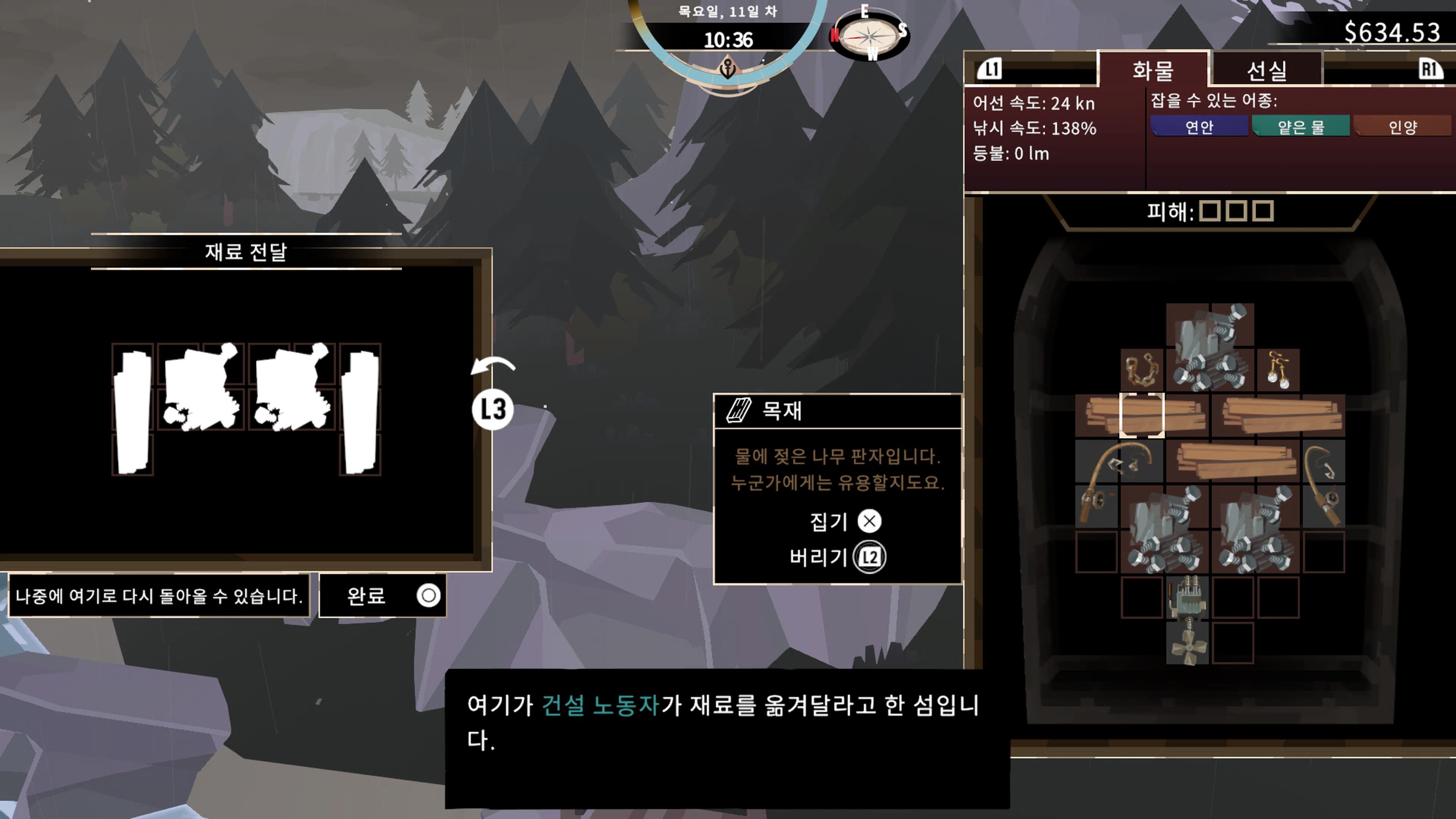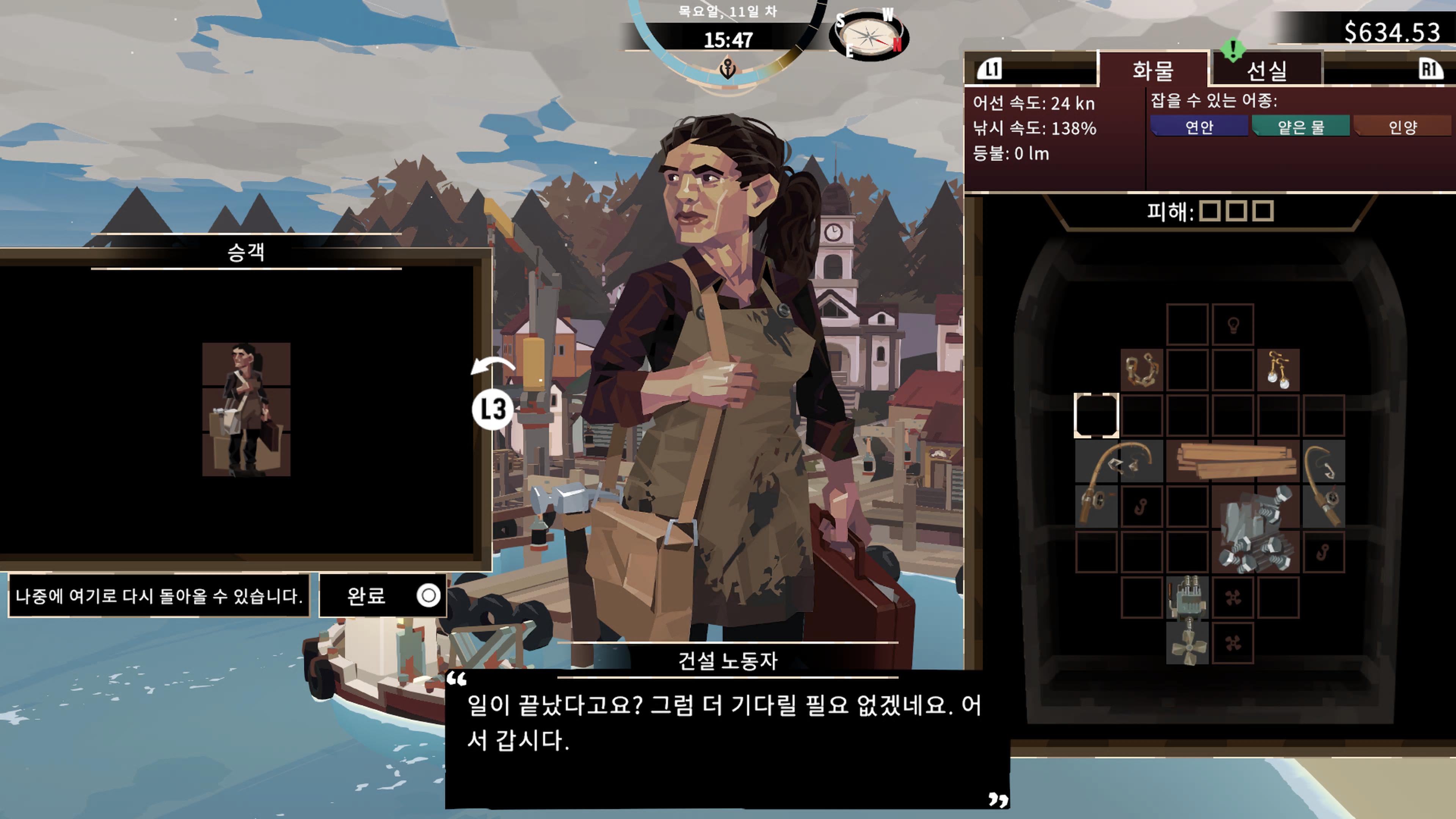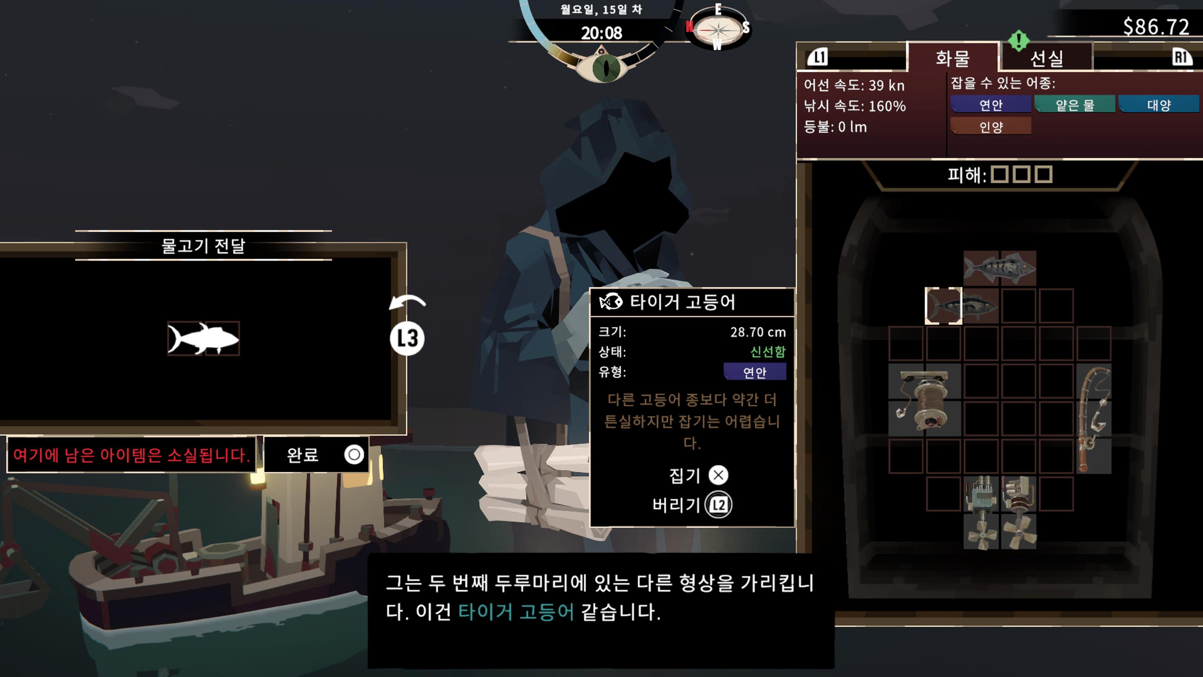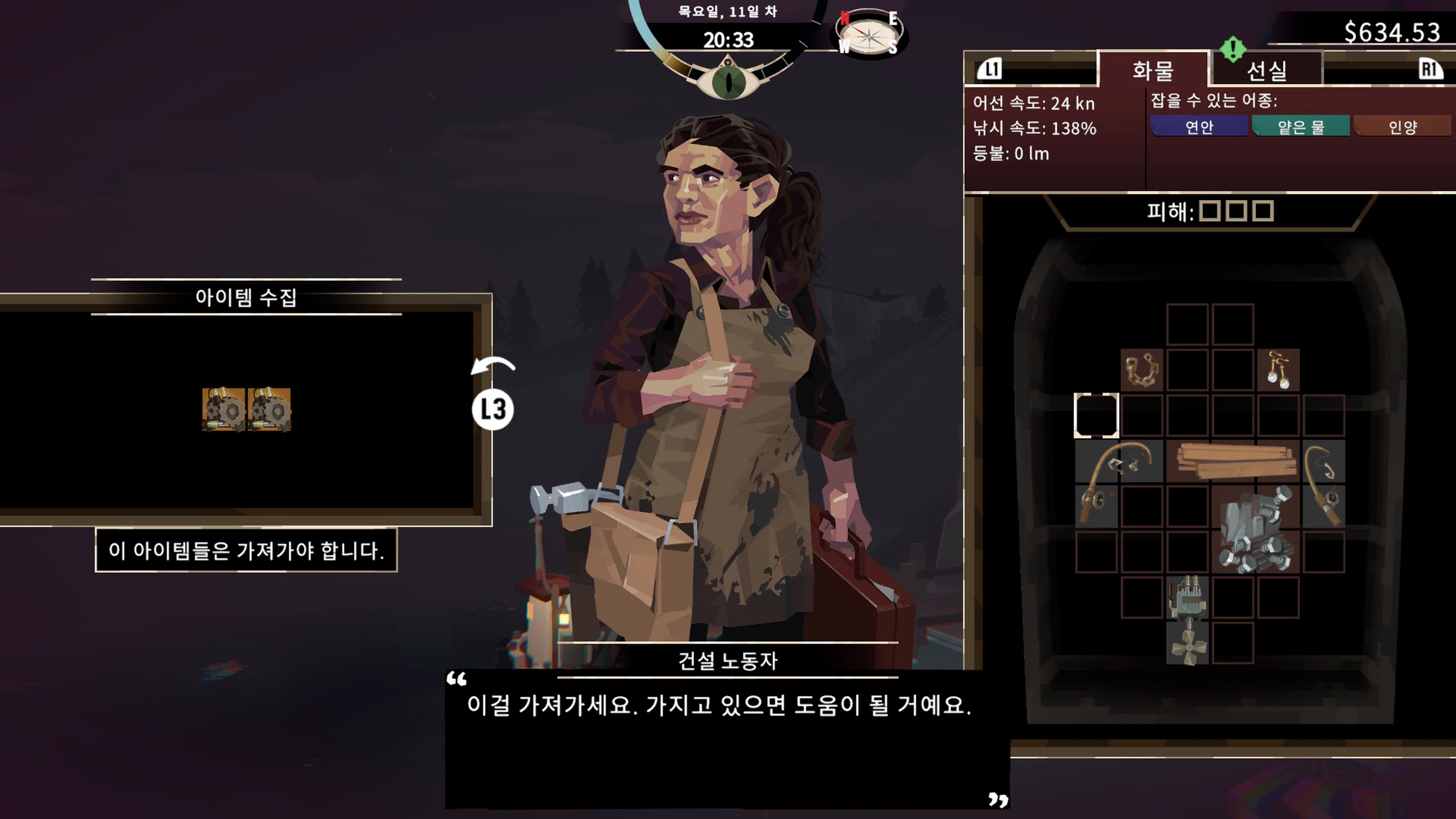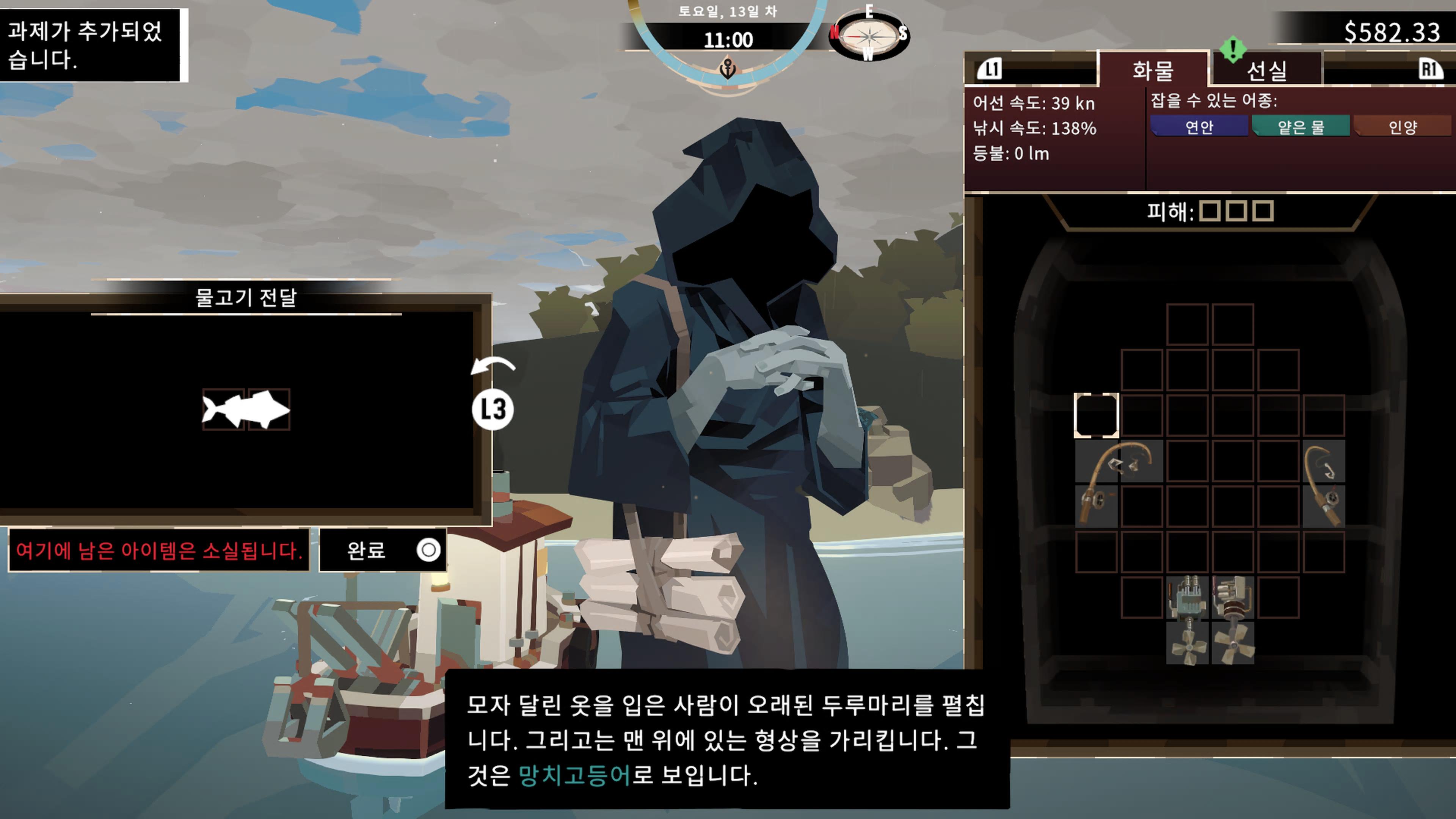 첫 퀘는 일단 조작법 안내에 가깝기 때문에 요구하는 대로 배에 아무 생선이나 좀 채워서 갖다 주면 된다.